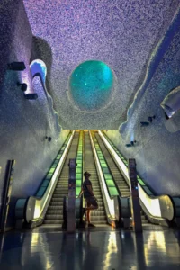 Le pareti sono ricoperte da mosaici di vetro azzurro che vanno dal celeste chiaro al blu profondo creando un effetto di immersione sottomarina amplificato da un gioco di luci che cambia continuamente tonalità. Scendendo verso i binari attraverso vari livelli ognuno con un’atmosfera diversa e più vai giù più il blu si intensifica fino a diventare quasi nero come se stessi scendendo negli abissi oceanici. È un’esperienza sensoriale totale che ti avvolge e ti trasporta in un’altra realtà.