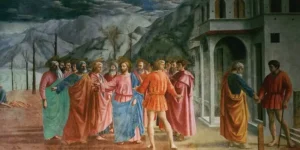 La scena più famosa e più studiata è quella del Tributo con San Pietro che per ordine di Cristo paga il tributo al gabelliere pescando una moneta dalla bocca di un pesce. Masaccio rappresenta tre momenti diversi della storia nello stesso affresco con Cristo al centro circondato dagli apostoli Pietro che pesca la moneta a sinistra e Pietro che paga il tributo a destra. Le figure sono monumentali, solide, piantate per terra con un peso fisico che nessun pittore prima era riuscito a rappresentare.